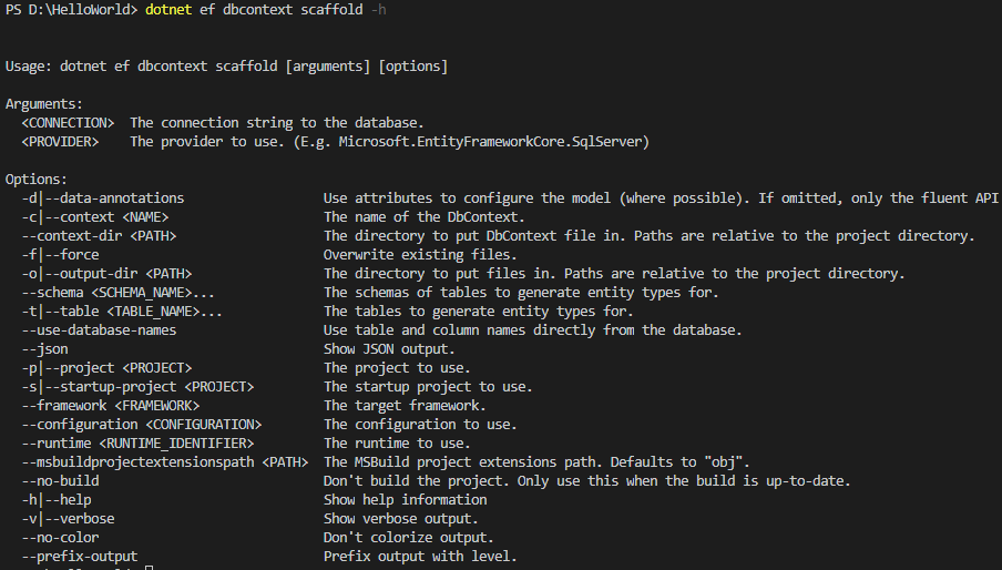 继续敲入命令行:dotnet ef dbcontext scaffold -h