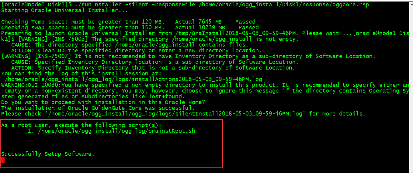 [oracle@node1 Disk1]$ ./runInstaller -silent -responseFile /home/oracle/ogg_install/Disk1/response/oggcore.rsp