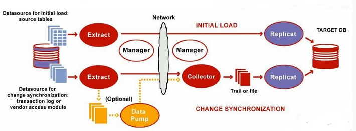 源端通过抽取进程提取redo log或archive log日志内容,通过pump进程(TCP/IP协议)发送到目标端,最后目标端的rep进程接收日志、解析并应用到目标端,进而完成数据同步。
