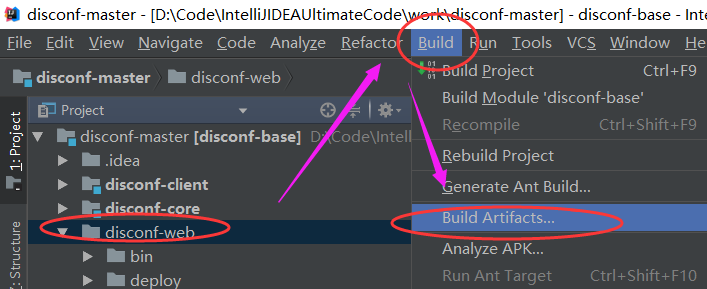 选择disconfig-web项目,在工具栏选择 Build -- Build Artifacts...,如果没有反应,则