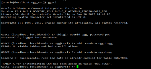 GGSCI (localhost as ogg@orcl) 4> add replicat rep1, exttrail /home/oracle/product/ogg_trg/dirdat/tr, checkpointtable ogg.checkpoint