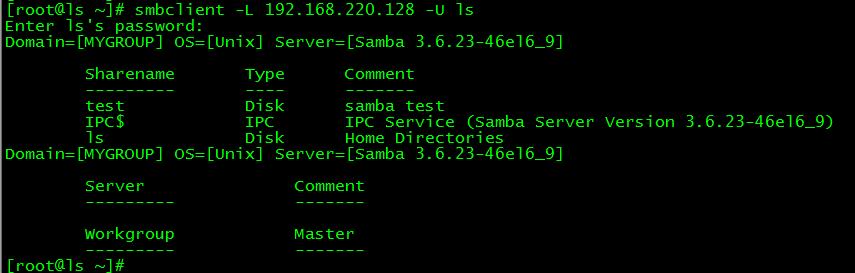 smbclient -L 192.168.220.128 -U ls   #192.168.220.128是我服务器的ip,ls是1.3中添加的用户