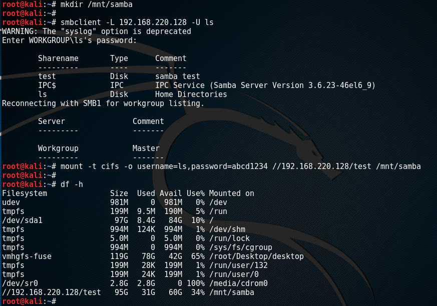 mount -t cifs -o username=ls,password=abcd1234 //192.168.220.128/test /mnt/samba    #username是用户名,abcd1234是用户相应的密码