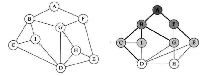以下面的例子为例,深度优先遍历的顶点访问序列为:{A B C D E F G H I};广度优先遍历的顶点访问序列为:{A B F C I G E D H}
