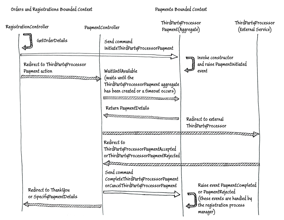 为了突出显示基于任务的UI中命令和查询的角色,故意简化了上图中所示的序列。例如,实际流程包括系统根据注册者选择的支付类型显示的页面,以及如果支付失败系统显示的错误页面。