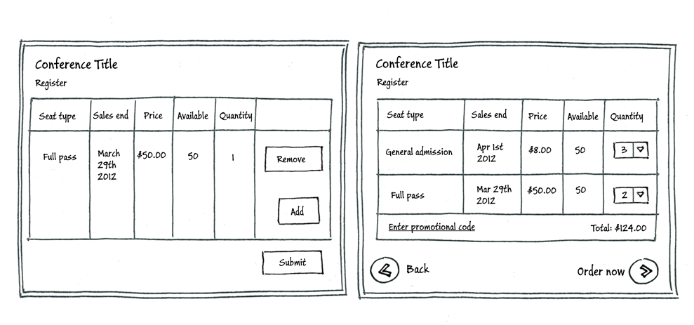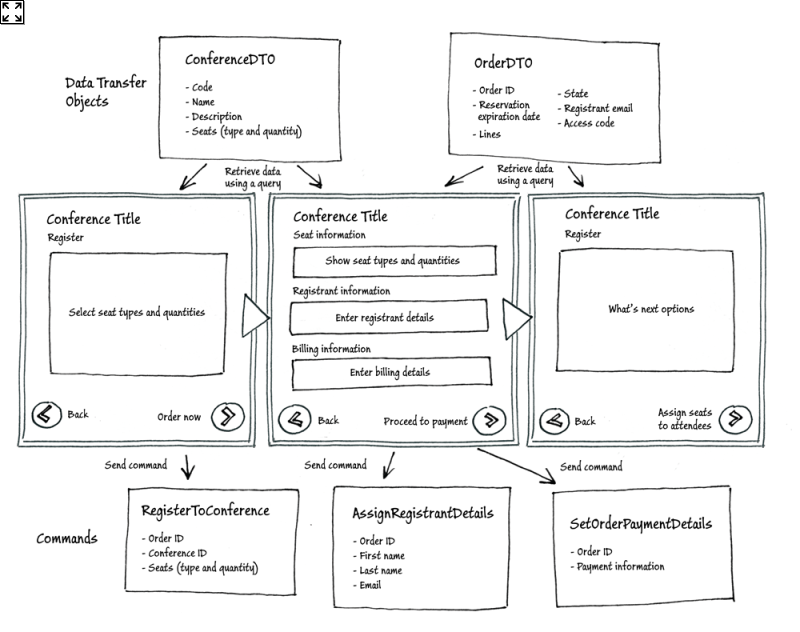 第二个屏幕更明确地显示了业务流程方面正在发生的事情:用户正在选择座位类型的数量作为会议注册任务的一部分。根据用户正在执行的任务来考虑UI,可以更容易地将UI与CQRS模式实现中的写模型关联起来。UI可以向写端发送命令,这些命令是写端领域模型的一部分。在实现CQRS模式的限界上下文中,UI通常查询读端并接收DTO,然后向写端发送命令。