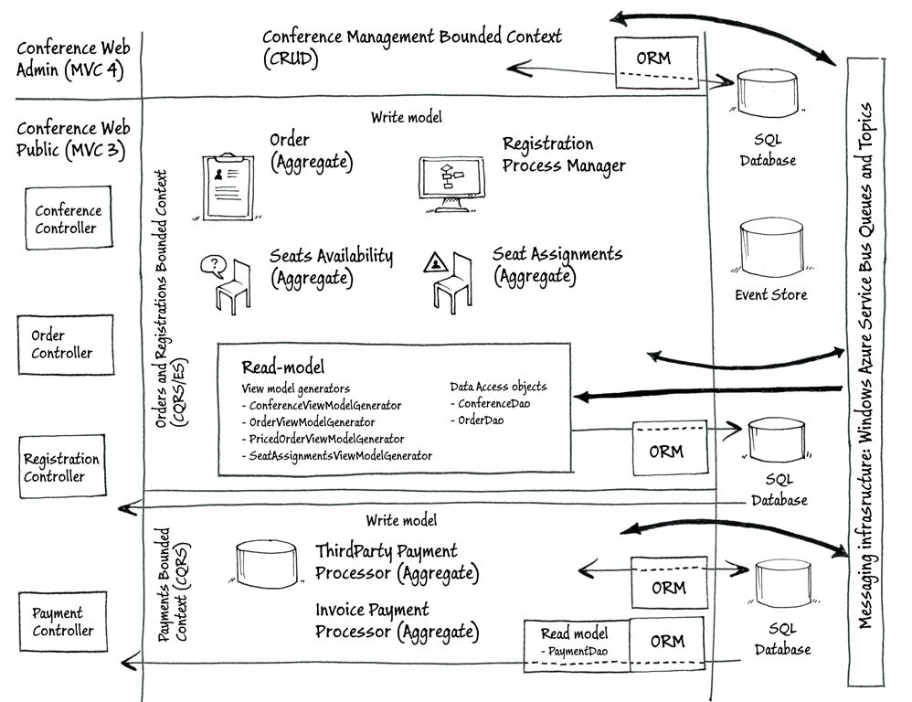 下图说明了在V1版本中Contoso会议管理系统的关键体系架构。该应用程序由两个网站和三个限界上下文组成。基础设施包括Microsoft Azure SQL数据库(SQL Database)实例、事件存储和消息传递基础设施。