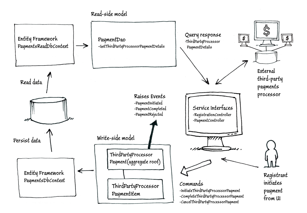 | RegistrationController | MVC Controller | RegisterToConference<br>AssignRegistrantDetails<br>InitiateThirdPartyProcessorPayment | DraftOrder<br>PricedOrder<br>SeatType |