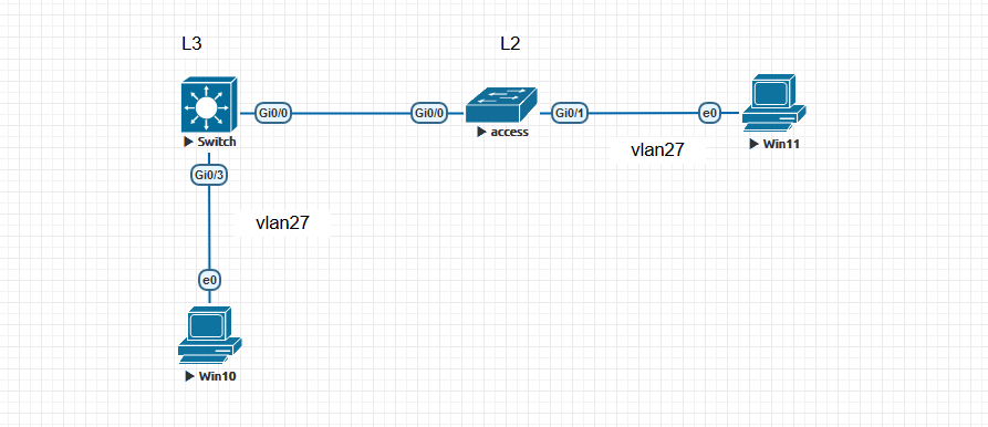 环境:dhcp server和dhcp客户端属于同vlan,但是客户端属于不同的交换机,在L2和L3交换机开启dhcp snooping后得出如下结论