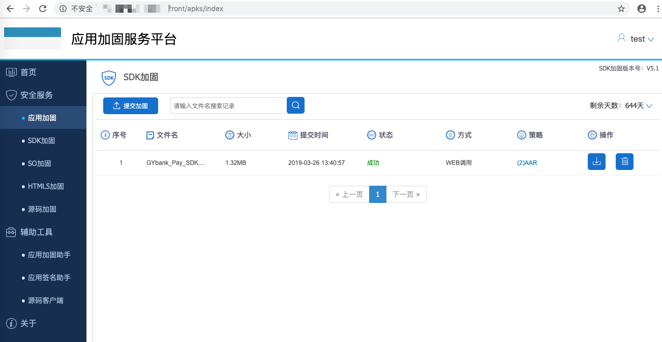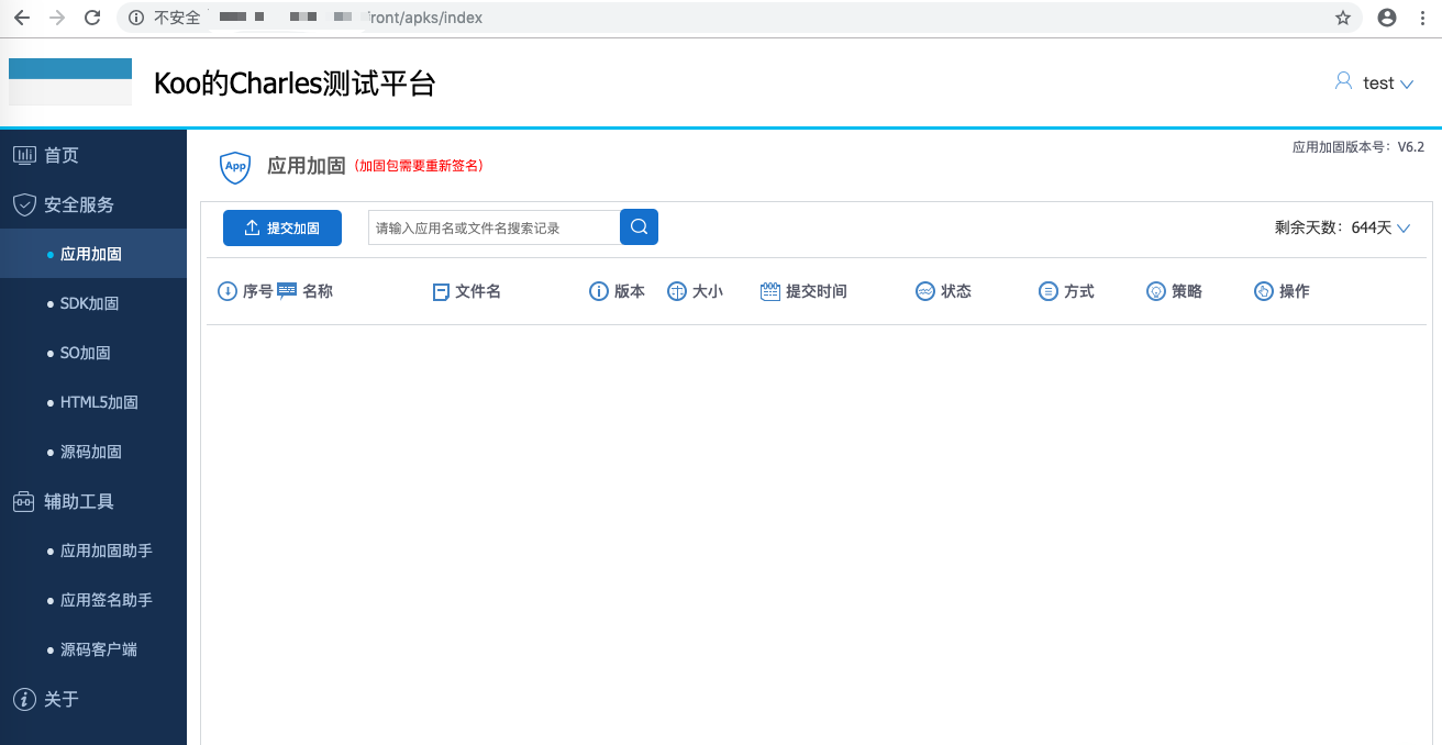 能抓包了,下面我们来做一些改动试试,我们先来打开一个应用加固界面,然后在charles中设置断点,并且查看浏览器中的页面
