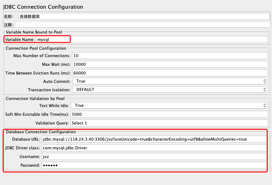 像上面这样,variable name:配置mysql连接池的名称,后面发sql请求的时候指定连接这里;database url:数据库连接的url,这个大家根据自己需要连接的数据库配置即可