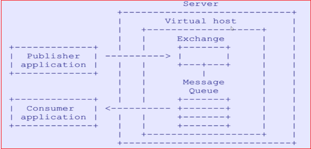 消息发布者会发送一个消息、exchange、routeing Key 到rabbtiMQ,他们先经过 Virtual Host , 再经过 Exchange, 再到Queue;消息消费者再到Queue中获取消息