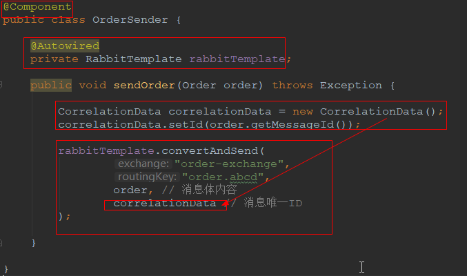 依赖注入RabbitTemplate的实例并调用实例方法convertAndSend发布消息