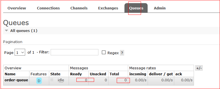由于rabbitMQ中已经有一条消息待处理了,所以直接启动项目就可以完成消息的消费,消费后rabbitMQ中待消费的消息数量就为0啦