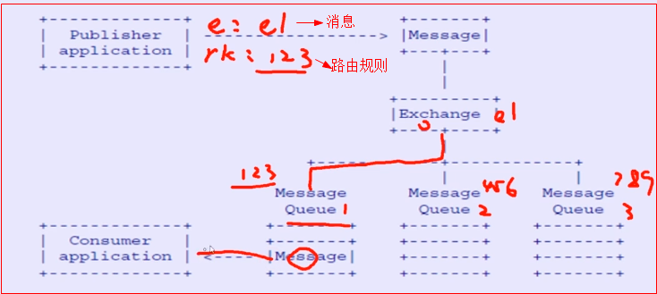 消息生产者将消息投递到exchange中,exchange会以某种路由机制将生产者投递的消息路由到queue中,消息消费者再从queue中获取消息进行消费。