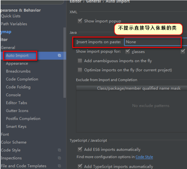 Editor为编辑器的设置,我们将General下面的Auto Import右侧Insert imports on paste设置为None,即不提示便可直接导入依赖的类。在General下面的Appearance右侧勾选Show line numbers设置显示代码行数。