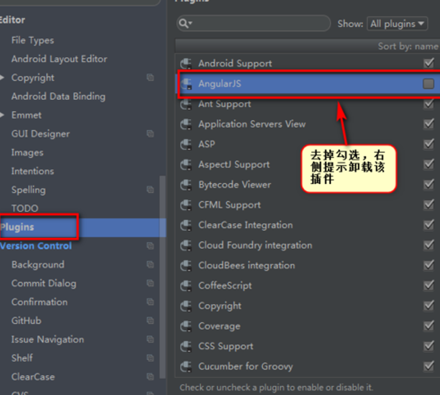 Plugins为插件,右侧显示已安装的插件,若想删除某个插件的安装,则去掉勾选,会在右侧提示卸载该插件。