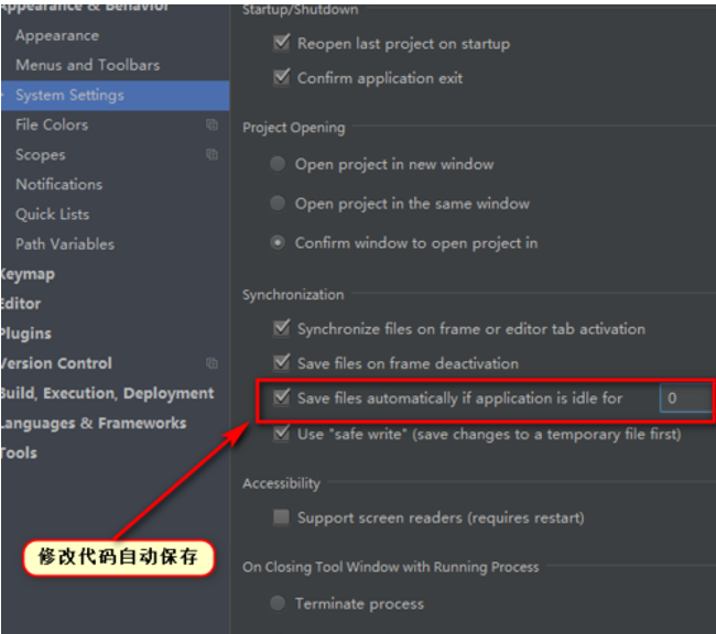 在Appearance & Behavier下面的System Settings中设置修改代码后自动保存。
