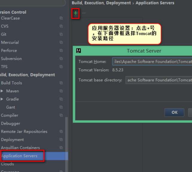 接下来配置Tomcat服务器,我们首先需要安装好Tomcat服务器,具体的安装步骤可以参考下文。在右侧点击+号,弹窗中选择Tomcat的安装路径即可。