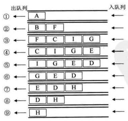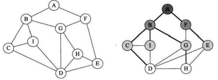 把左图拉平,按照层序把结点排列下来,各节点的连接关系并没有变,图结构没有发生变化,但是这时,我们从A出发,按层序遍历可以得到顺序是 A B F C I G E D H