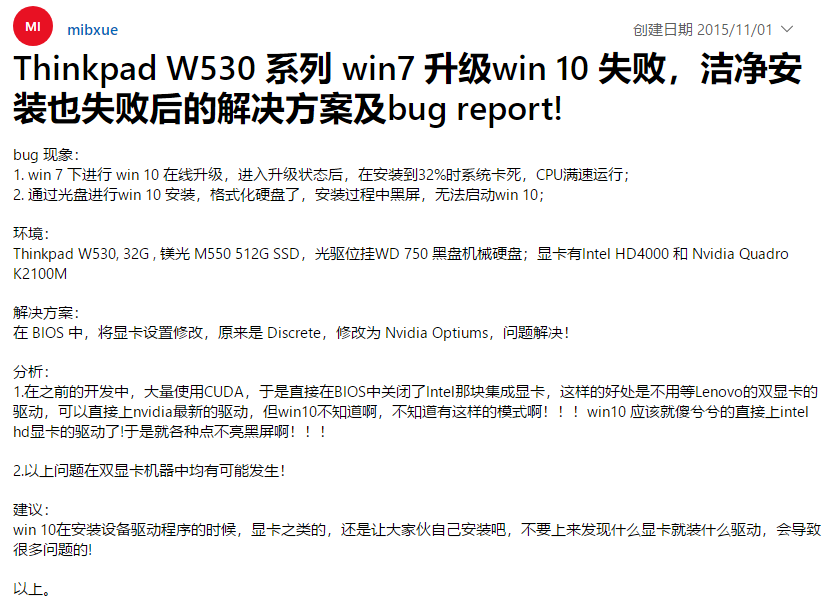 1. 电脑 (主要还是以 Thinkpad 系列电脑 为主)win7 升级win 10 失败,用各种洁净方法 安装纯净版也失败。