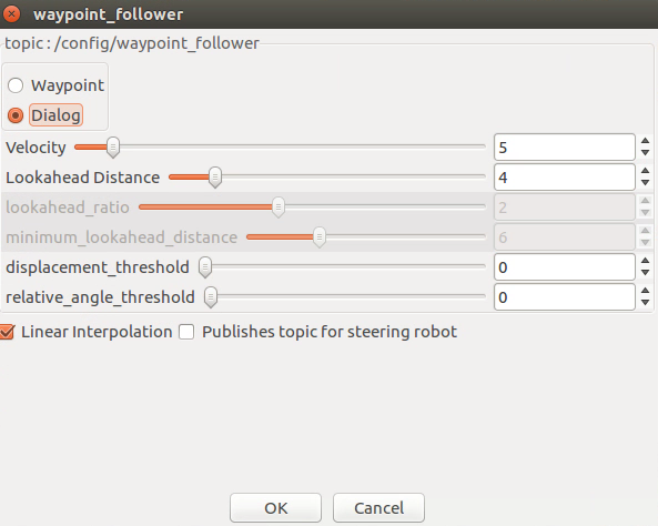[waypoint_follower] 的 [app] 在打开的菜单栏如上左图所示,勾选 [Dlalog] 选项,确保 [Velocity]( 手动设置速度 ) 选项值不能太大,因为这里是路点跟随中设置速度的地方,[Waypoint] 模式下速度即是制作路点文件中记录的 bag 文件的车速,已经被写入路点文件中,而 [Dlalog] 模式则可以手动设置车辆速度。