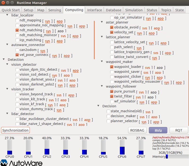 (2)在菜单栏 [Computing] 右侧的 [astar_planner] 下的 [obstacle_avold], [velocity_set] 并勾选,如下所示:
