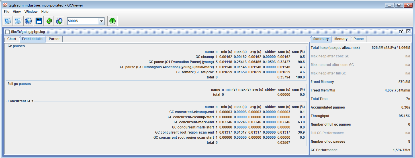 因为在当前的GC日志抓取中,未存在Mixed GC,因此此处就不对Mixed GC日志进行分析(感兴趣的读者可以在较大的程序中获取G1 GC日志进行进一步分析)。虽然G1的GC日志虽然步骤很清晰,但是每次GC均会有大量日志产生,不便于根据日志进行分析,因此我推荐使用GCViewer可视化工具辅助进行分析。导入GC日志,信息如下图所示: