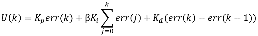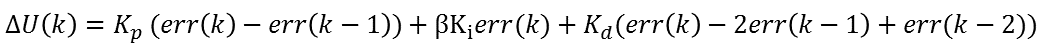 其中β的取值与位置型PID算法一致。可能有人会担心偏差来回变化,造成积分作用的频繁分离和引入,进而使上述的增量表达式无法实现。其实我们分析一下就能发现,在开始时,由于设定值变化引起的偏差大而分离了积分作用,在接近设定值时,偏差变小就引入了积分,一边消除静差,而后处于稳态,直到下一次变化。