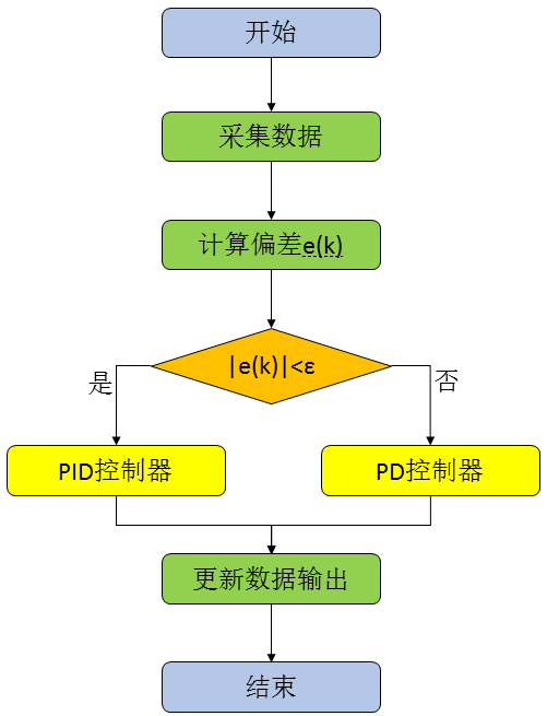 这一部分,我们根据前面对其基本思想的描述,来实现基于积分分离的PID算法实现,同样是包括位置型和增量型两种实现方式。首先我们来看一下算法的实现过程,具体的流程图如下: