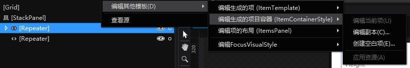 最后可以在Repeater上添加StyleTypedPropertyAttribute,指定ItemContainerStyle的类型为RepeaterItem。添加这个Attribute后在Blend中选择“编辑生成项目的容器(ItemContainerStyle)”就会默认使用RepeaterItem的样式。