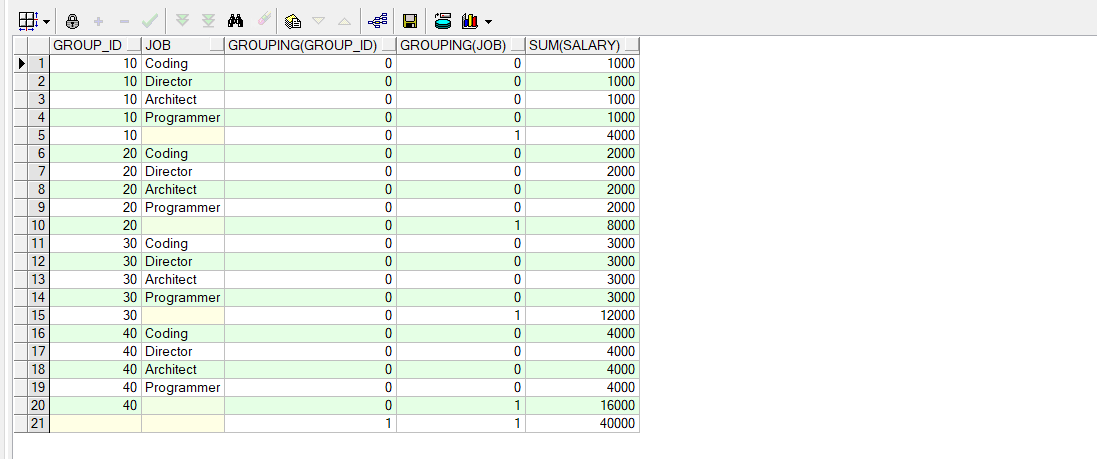 select group_id,job,grouping(GROUP_ID),grouping(JOB),sum(salary) from group_test group by rollup(group_id,job);