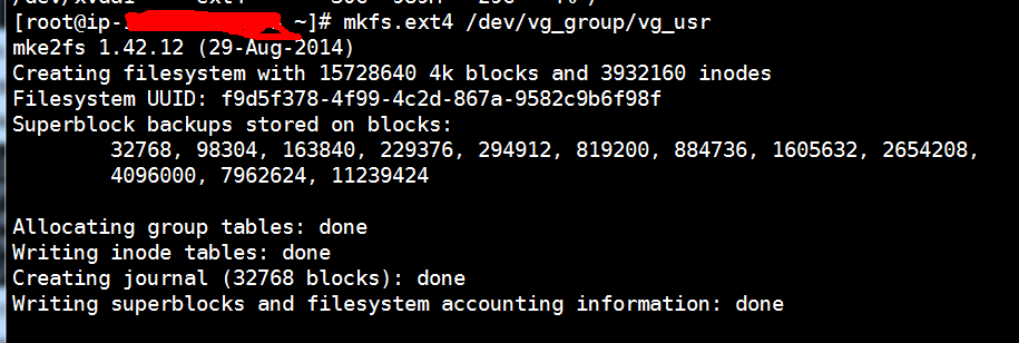 输入:mkfs.ext4 /dev/vg_group/vg_usr