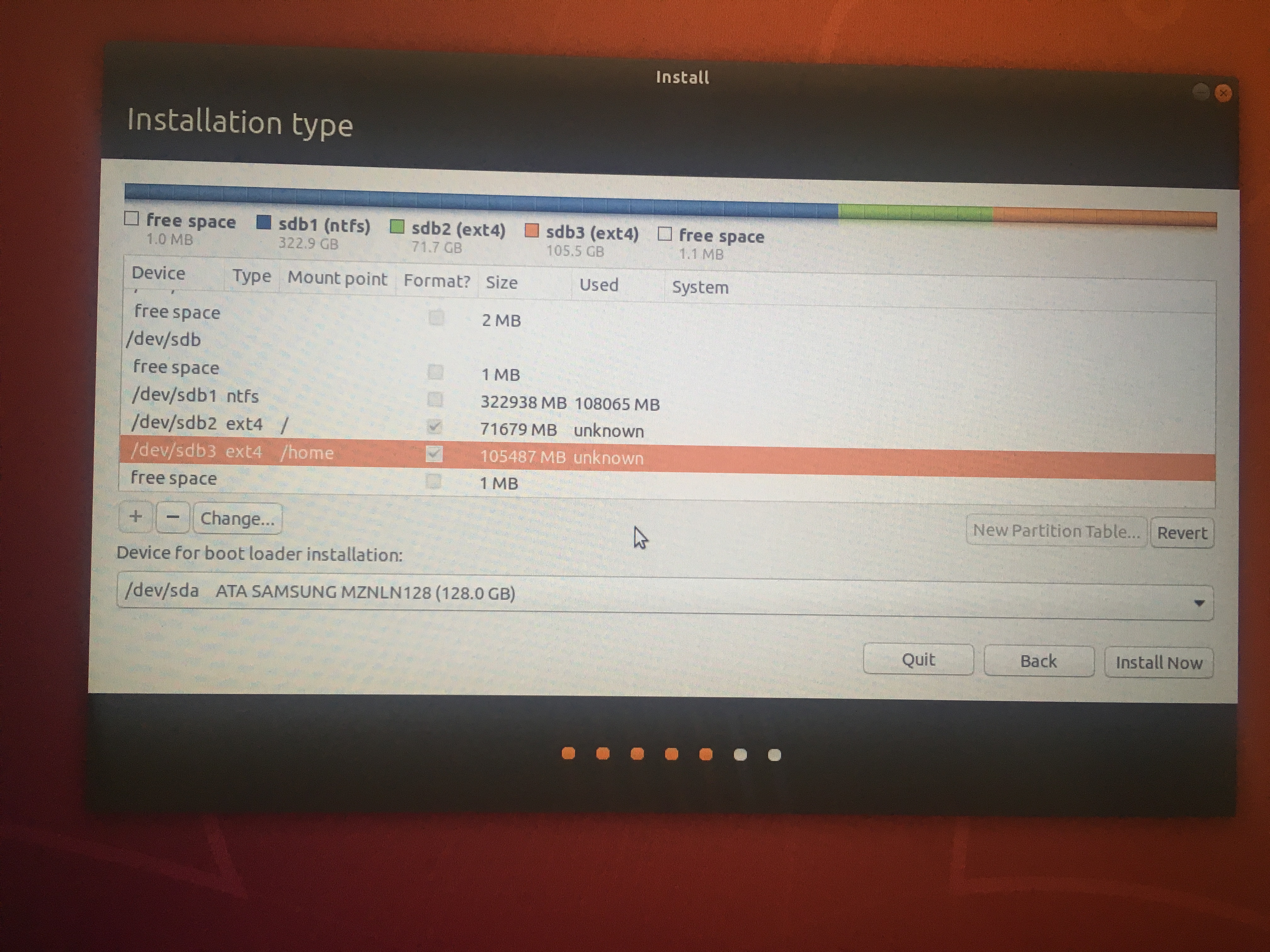 选择,Something else,进入自定义安装,点击Continue。进入分区界面,