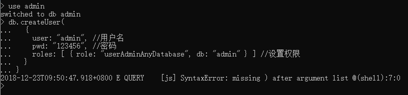roles: [ { role: "userAdminAnyDatabase", db: "admin" } ] //设置权限