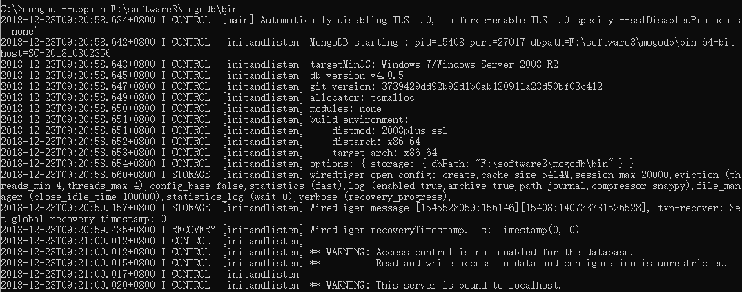 2018-12-23T09:21:00.015+0800 I CONTROL [initandlisten] ** Read and write access to data and configuration is unrestricted.