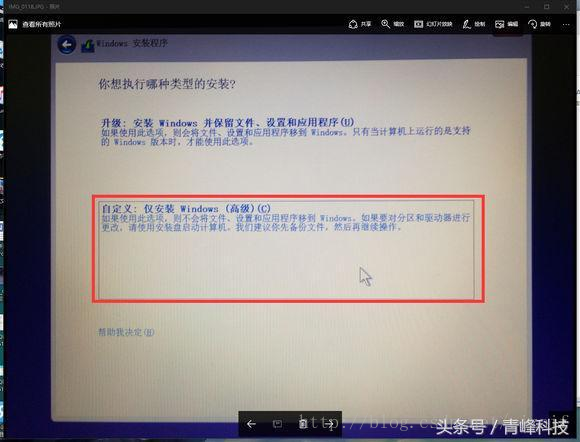 2:进入win10 安装, 在选择安装方式时,选择自定义 百度的图片:
