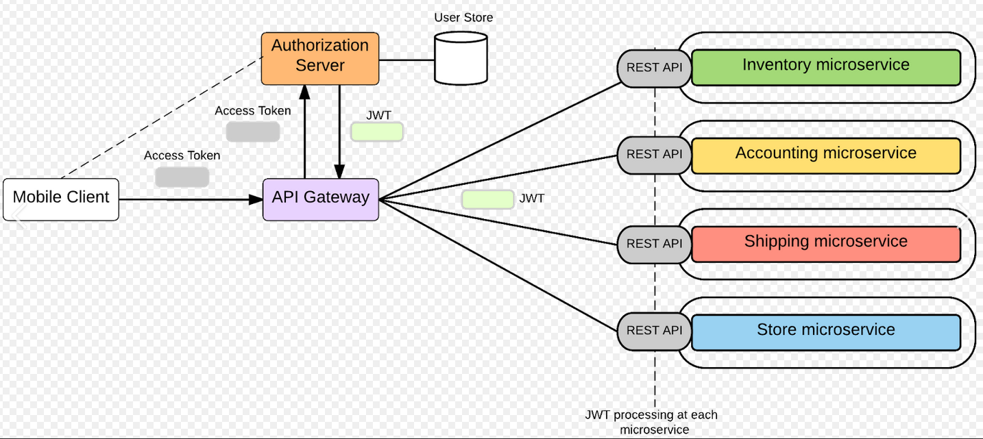 (图片来自网络)如图,这是一种采用基于令牌Token的授权方式。在这个模式下,是由授权服务器(图中Authorization Server)、API网关(图中API Gateway)、内部的微服务节点几个模块组成。
