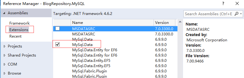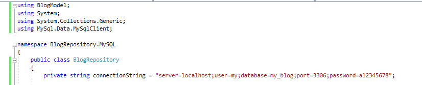 1. 创建一个新的类库项目BlogRepository.MySQL,并引用Mysql.Data(注:Mysql.Data需要安装Connector/NET):