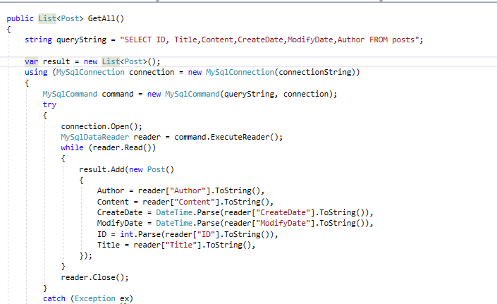 本章介绍了如何在ASP.NET中使用MySQL数据库,它的使用方式与SQL Server基本相同,只需要安装连接My SQL需要的组件即可。另外需要注意的一个问题是,现在在整个解决方案中分别有BlogRepository以及BlogRepository.MySQL两个仓储类库,分别对于SQL Server和My SQL但是逻辑层只有一个,这就意味着每次更换数据库业务逻辑库不仅要更换引用,还要修改代码。这就是典型的依赖实现而没有依赖抽象的问题。这个问题会在后续介绍解决方法。