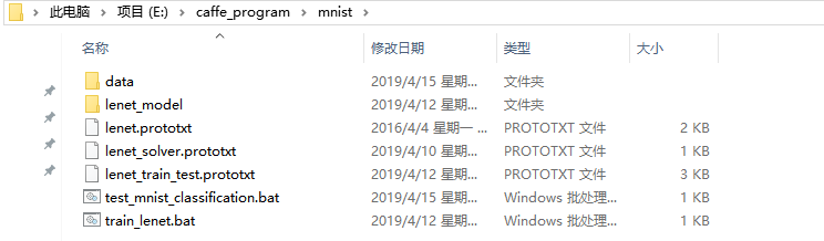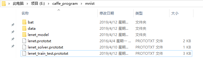首先还是要先介绍一下我的文件目录,我在目录E:\caffe_program下面创建了一个mnist文件夹,mnist文件夹下面包括了所有训练模型的必要文件,还要保存训练之后的模型。请看mnist文件夹下的文件结构: