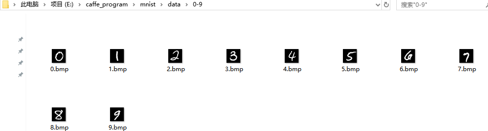 在mnist文件夹下创建一个文本文件,然后将其修改为“test_mnist_classification.bat”,写入批处理命令,运行即可在中端中显示top5的预测结果。需要预测的数据放在data/0-9/文件夹下面,0-9文件夹详细内容如下: