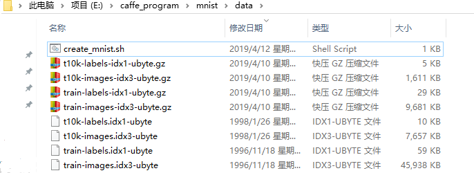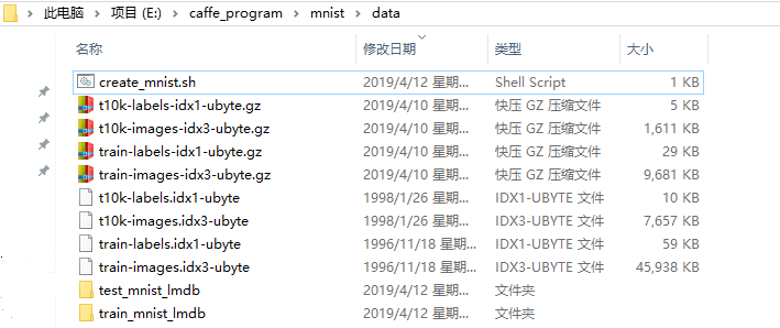 在编译好的Caffe中存在将MNIST数据集转换为LMDB的create_mnist.sh脚本文件,它的具体位置在D:\你的安装目录\caffe\caffe-windows\examples\mnist。我将其复制到我的项目之下(最好不要在原文件上修改),即放在我的data文件夹之下,具体路径是E:\caffe_program\mnist\data,文件目录如下: