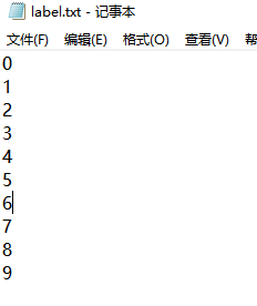 因为这里是训练测试MNIST数据集,因此标签label就是0-9,我在data文件夹下创建标签文件“label.txt”,详细展示如下:
