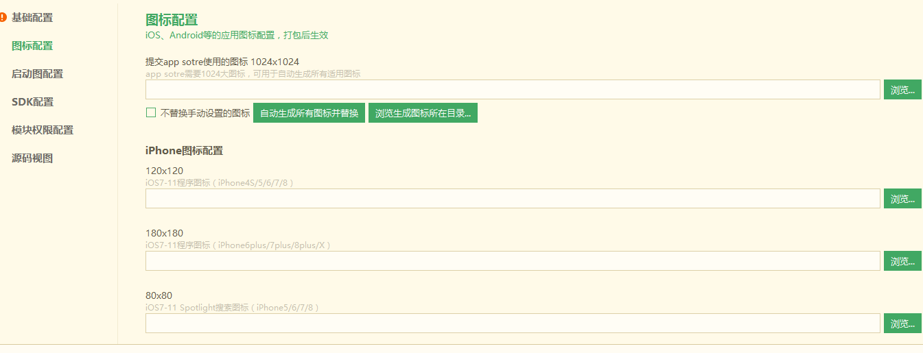 图标就是App安装到手机后显示的图标,选择第一张图标后可以点击“自动生成所有图标并替换”,会自动生成适配不同大小的图标。