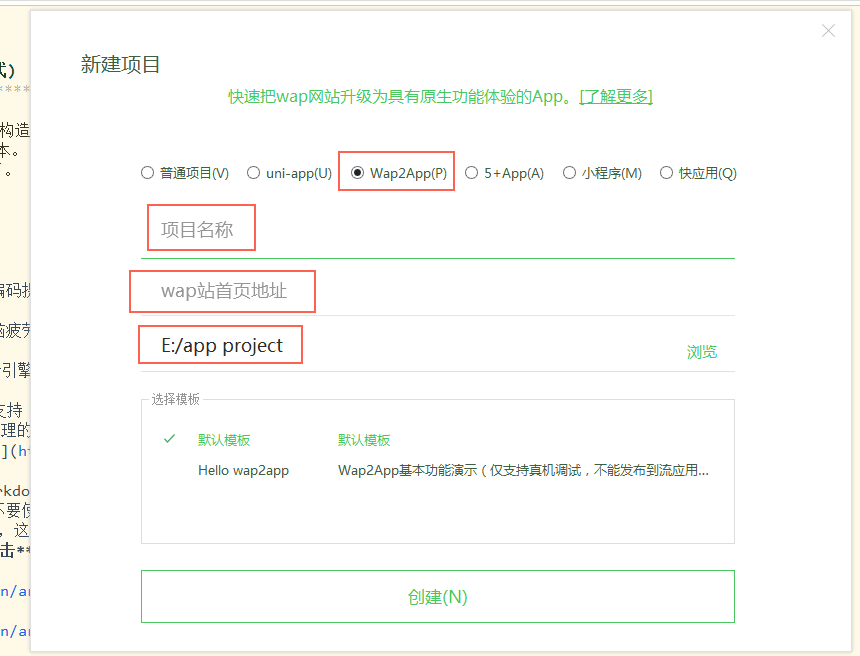 选择wap2app,填入项目名称,wap站首页地址,选择项目文件路径,创建。