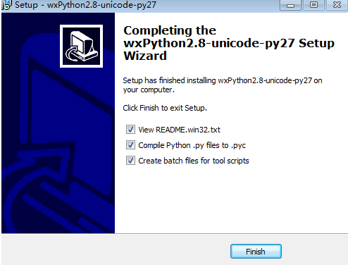 所以wxPython只能安装的版本为: 2.8.12.1, 执行命令行执行命令为:pip install wxPython=2.8.12.1安装失败,只有在这个网址http://sourceforge.net/projects/wxpython/files/wxPython/2.8.12.1/ 下载 wxPython2.8-win32-unicode-2.8.12.1-py27.exe 双击exe文件安装