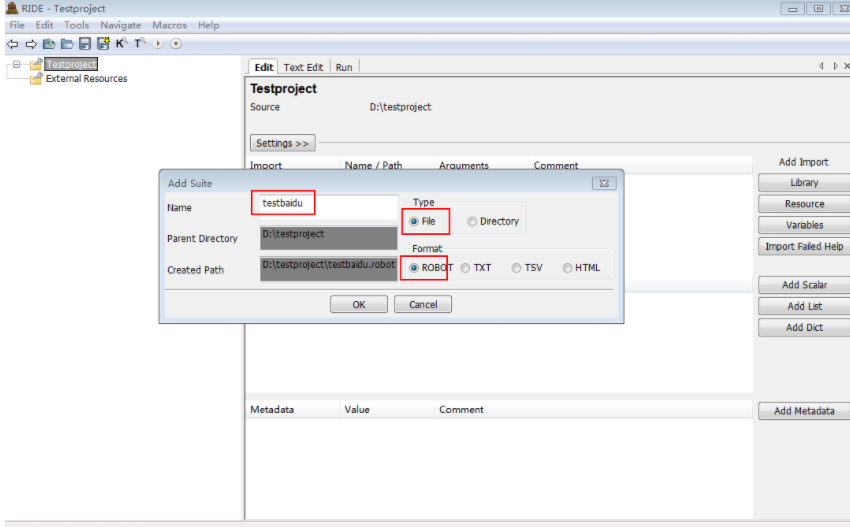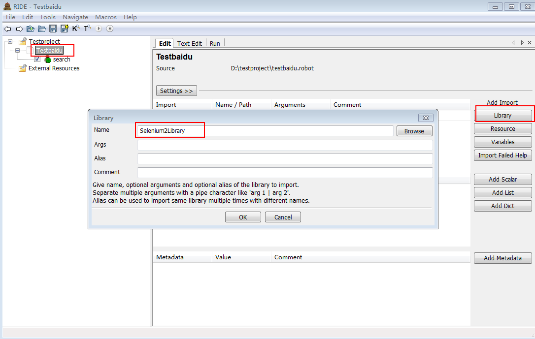 3、test suite中导入selenium、appium库, 在导入界面中name 输入;Selenium2Library。同样的方法导入AppiumLibrary