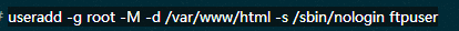 说明:添加 ftpuser 用户组为root 组 -d 代表用户登录后的主目录 -s:指定用户登入后所使用的shell -M:不要自动建立用户的登入目录。