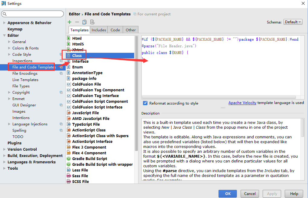 在File->Settings->Editor->File and Code Templates下分别修改Class,Interface,Enum等注释模板,Class模板部分修改如下,其余的举一反三进行修改。以下所示的${DESCRIPTION}是自定义变量,会在创建类时请求输入